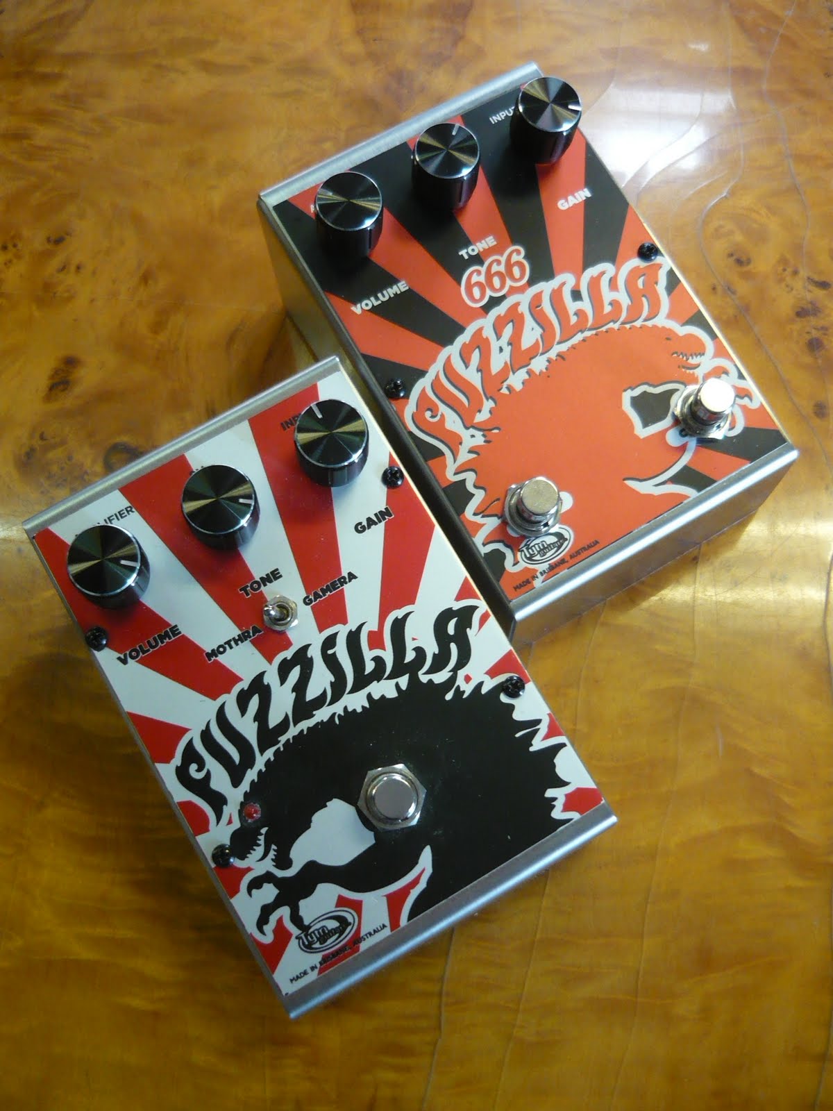This 666 version is added to the current "little brother" Fuzzilla which is my homage to the GREAT Companion/Shen-ei FY2 using 2 old stock C945 transistors. This pedal was THE original Japanese fuzz pedal also sold as the original Univox SuperFuzz in the US. I have added a toggle switch for "Mothra" or "Gamera" which goes from std FY2 with a slight boost to bring it up to bypass volume (the original dropped in volume like most early fuzzes) to an FY2 with tone control and more boost. Volume and gain are the only other things you'll need.