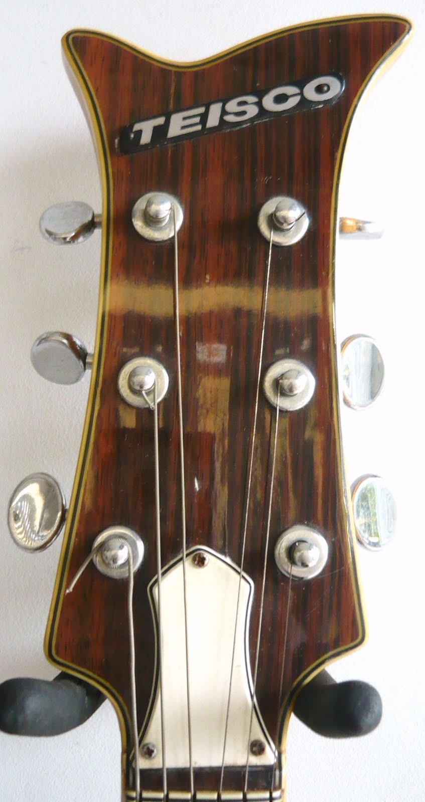 Next I got the Vamper or the EV52-T. Obviously heavily inspired by Mosrite with a little Burns thrown in, these were offered in a few different versions and slightly later as a much "cut down" V2 version. I needed to have the one with all the bells and whistles and here it is. This is fully bound and inlayed, as top of the line Teiscos were AND has active electronics. The tone control sliders are essentially a sophisticated parametric EQ that is incredibly good and very quiet. The neck on this is AWESOME. VERY Mosrite with a thin but very comfortable profile. The pick ups have plenty of sparkle and bottom end especially with the tone shaping circuit on.