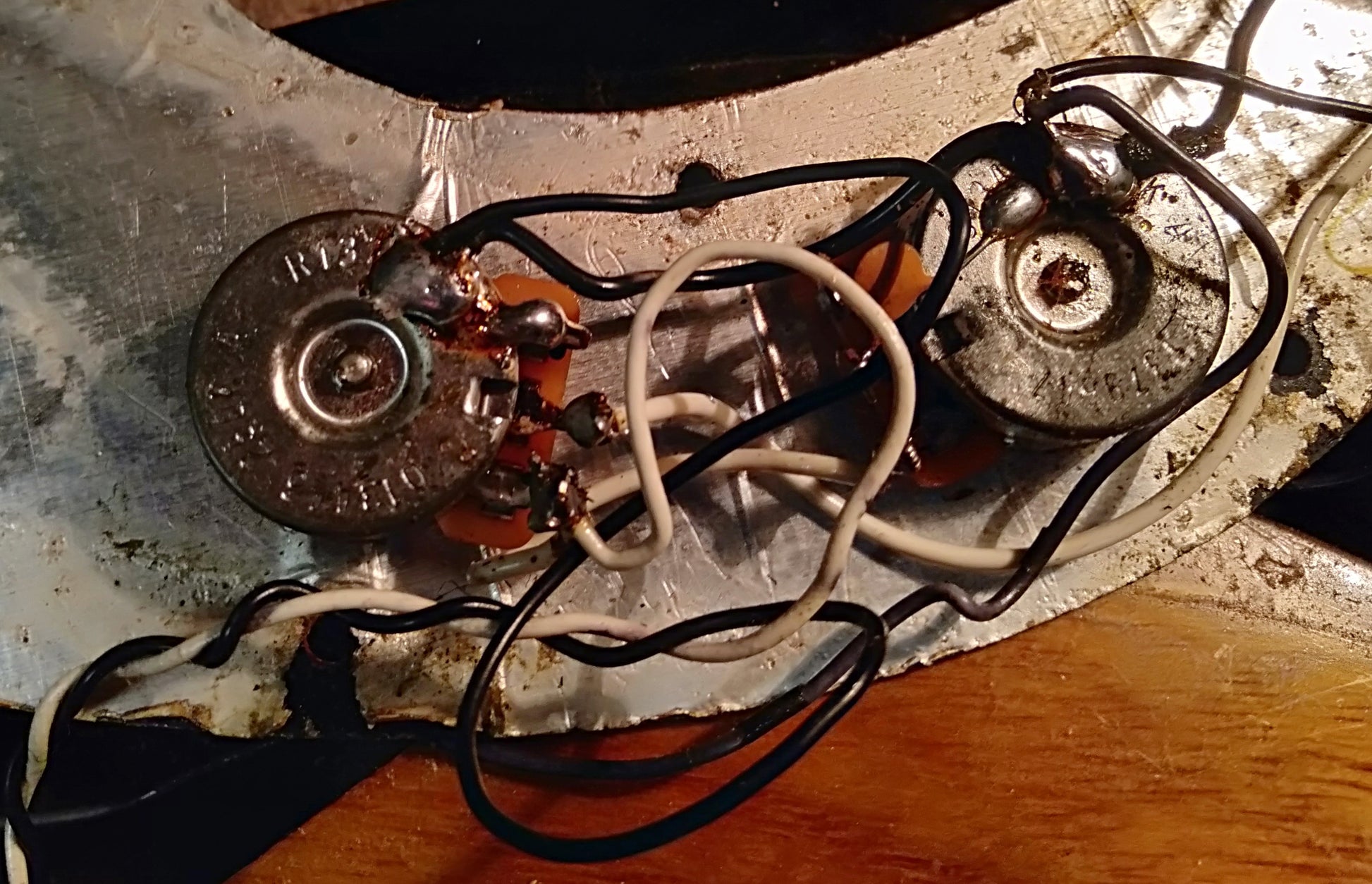 MI USA. Fender P bass with heavy ash body. Bolt on maple on maple neck. Lots of honest player wear, chips and scratches. Headstock serial dates 1979. Neck pocket serial matches headstock. 1 non original pot dates 1990. Other original pot covered with solder. Original grey bobbin pickups. Original tuners. Original F stamped neck plate. Original scratchplate cracked near jack but still works fine. Non original knobs. Great neck and sounds huge. With original Fender hardcase.