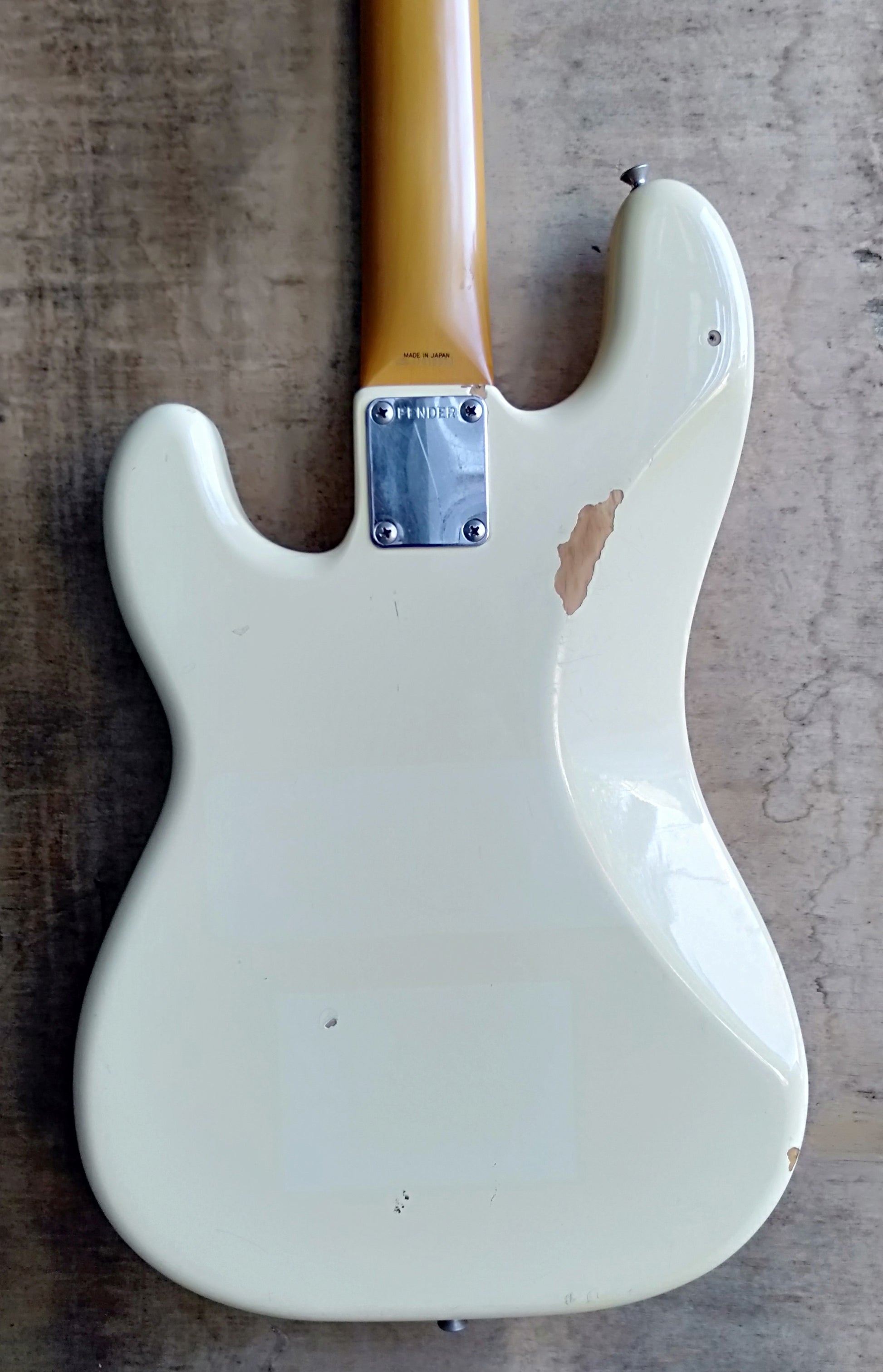 MIJ. '72 re-issue. Good condition with lots of player wear, chips, scratches and some sticker fade. All original except for Seymour Duncan SPB-1 pickups. No breaks or repairs. Great off-white finish with black plate. Solid alder body. Bolt on maple neck with rosewood fretboard. Very played but looks and sounds great. No case but can supply new hardcase for $120 (contact to add).