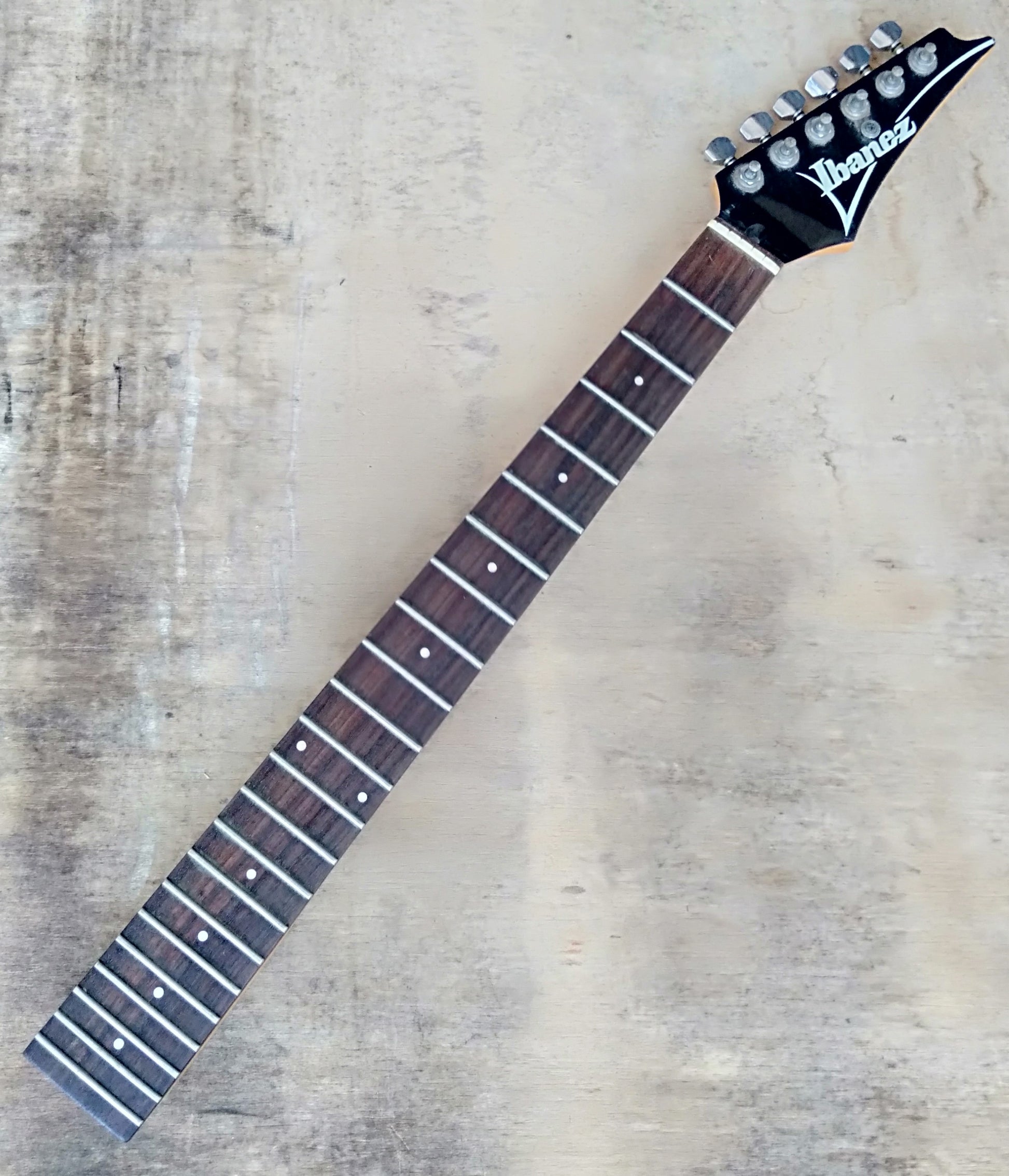 Ibanez neck. Older Korean or Japanese neck. Good condition. Trussrod works. 25.5" scale. Original sealed gear tuners.