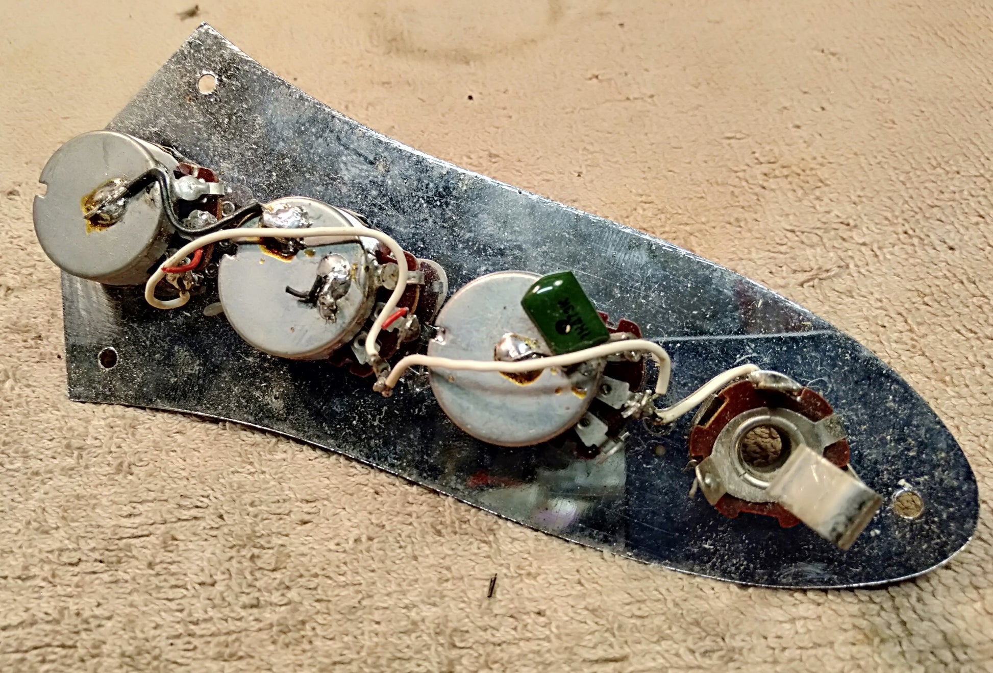 Vintage Japanese J bass control plate with pots and output jack. Possibly from 70's Greco or Aria (or similar) bass. Chrome is OK with corrosion.