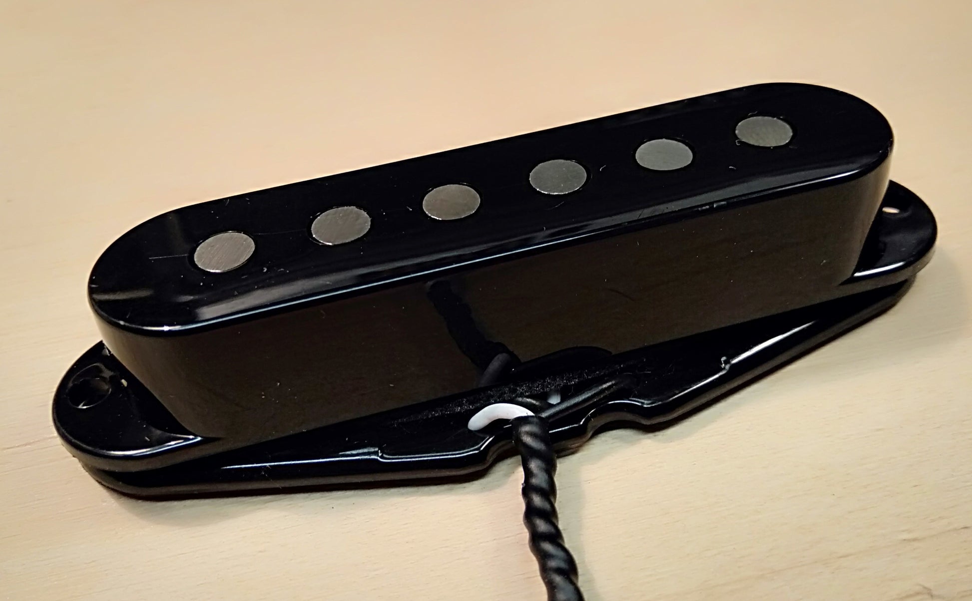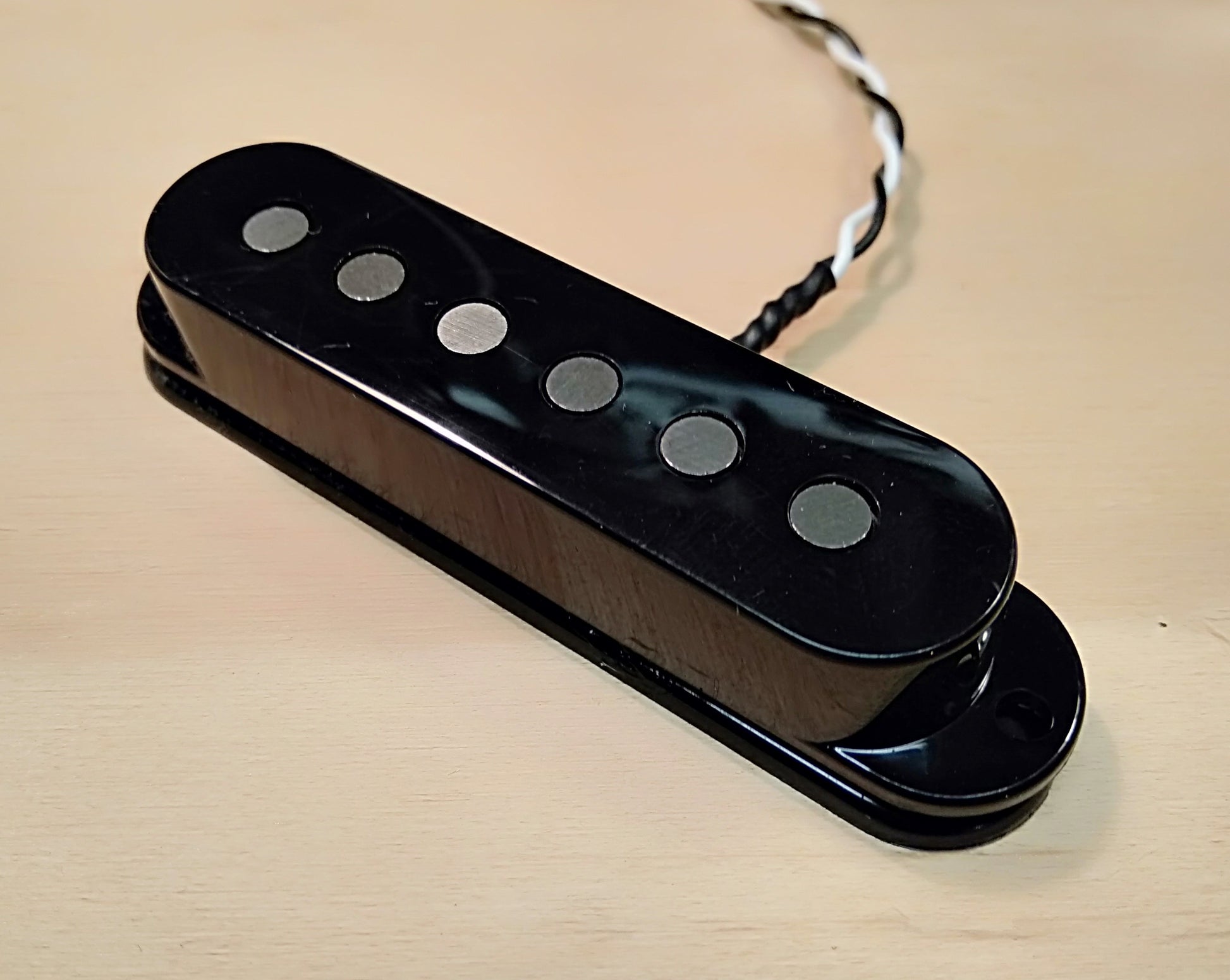 This is a 14.3K bridge pickup that will drop into any Strat or Johnny Ramone replica or sound-a-like. These are hand wound with AWG44 plain enamel wire. String spacing is 49mm. Lead wires are approx. 300mm and are black and white like the originals. None of my pickups are potted.