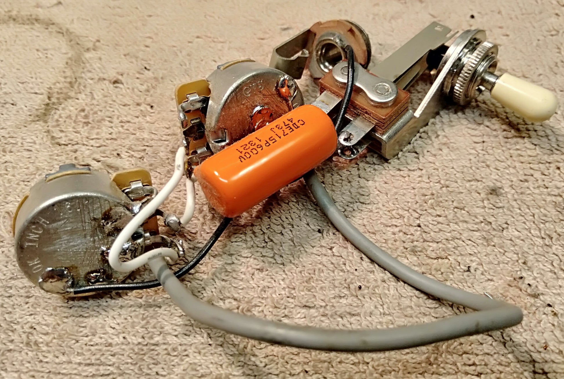 Wiring loom of 2 pots, Sprague cap, 3-way switch and output jack from 2000's Gibson.